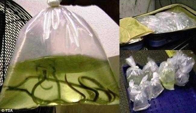 Isso aconteceu no aeroporto internacional de Atlanta em 2007. Um homem vindo da Coréia do Sul carregava uma mala com frascos e garrafas cheias de cobras venenosas mortas.