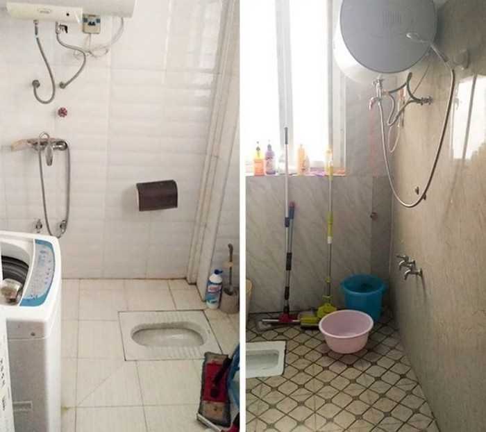 8 – A água do chuveiro e da máquina de lavar escorre pelo chão e vai para o vaso sanitário (no chão). Não há banheiras nos apartamentos, apenas chuveiros. E não há box de chuveiro