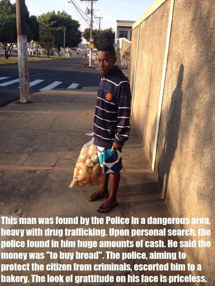 6 – Este rapaz foi abordado pela polícia em um local onde há bastante tráfico de drogas e informou que o dinheiro encontrado em revista pessoal era para comprar pão. A equipe policial decidiu então escoltar o cidadão até a padaria para que ele não fosse roubado