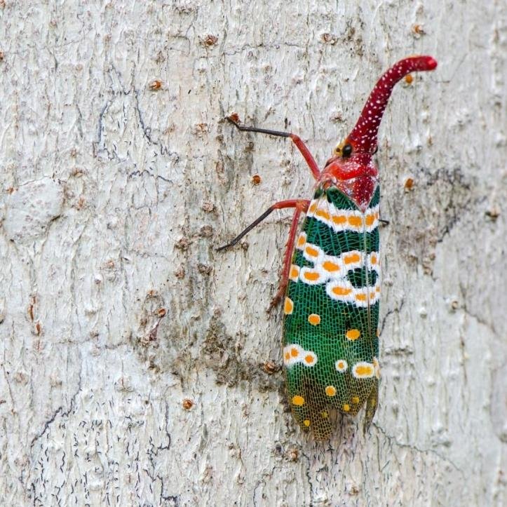 12. A mosca-lanterna-pintada tem um nariz que funciona como um canudo, que ajuda esse inseto a sugar a seiva das plantas.