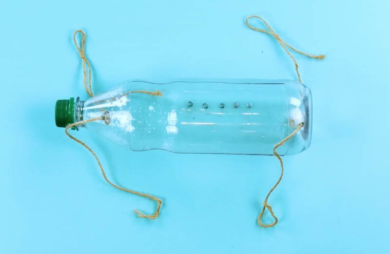 1.4. Passe 2 pedaços de corda de mesmo tamanho pelos 2 orifícios na parte inferior e superior da garrafa.