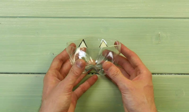 Corte o fundo da garrafa ao longo da borda da fita e ao redor dos 2 triângulos. Em seguida, remova a fita adesiva.