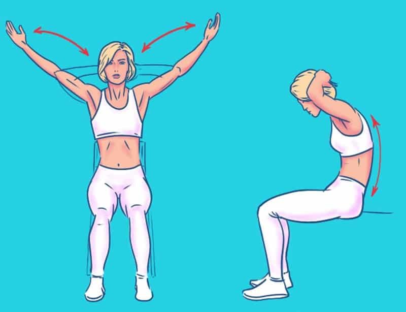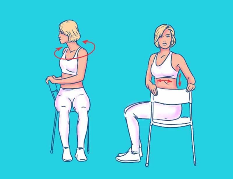 Execução: Sente-se em uma cadeira para que seus pés fiquem apoiados por completo. Endireite as costas, vire os ombros primeiro para um lado e depois para o outro.