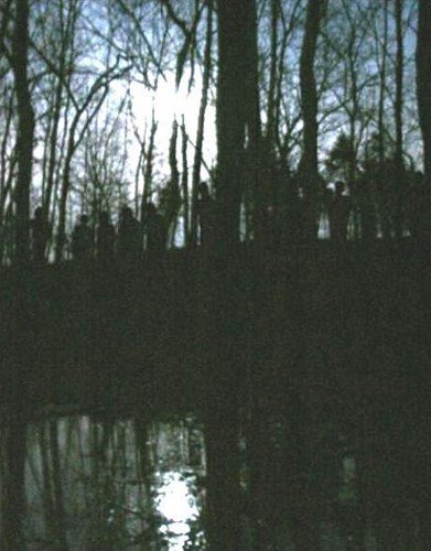 Fotografia tirada no Missouri, nos EUA, em um lugar conhecido como Estrada Zombie. A imagem mostra várias silhuetas perto de um rio.