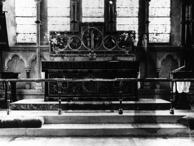 Foto tirada pelo padre KF Lord, em 1960, na Inglaterra. Ao fotografar o altar de sua igreja, apareceu também uma imagem de escura, como alguém com capuz em pé, descendo as escadas.
