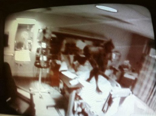 Foto tirada do monitor de visualização de uma equipe de enfermagem. Uma figura negra aparece em cima de um paciente, que morreu horas depois que a foto foi tirada.