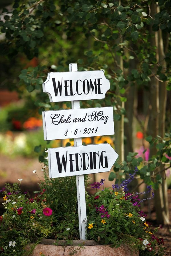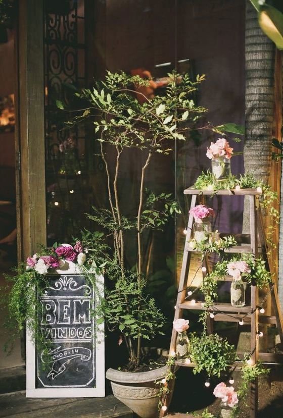Uma solução simples com vasos de flores organizados em cavalete de madeira. A placa estilizada tem o nome dos noivos e recepciona os convidados.