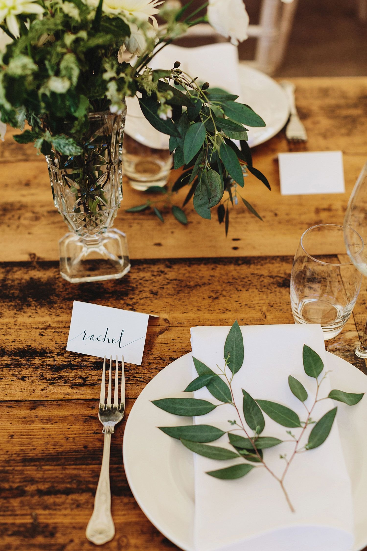 Os ramos de folhas são ótimos aliados na decoração da mesa de casamento e criam um efeito especial e delicado para os pratos.