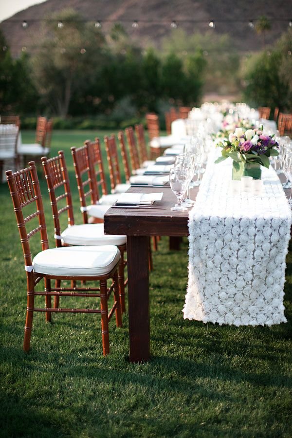 Uma mesa simples com toalha central extensa e arranjos de flores simples.