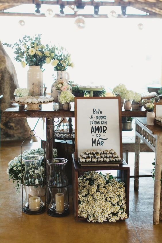 Imagem 24 – Velas e flores mesclam perfeitamente com caixotes de feira.