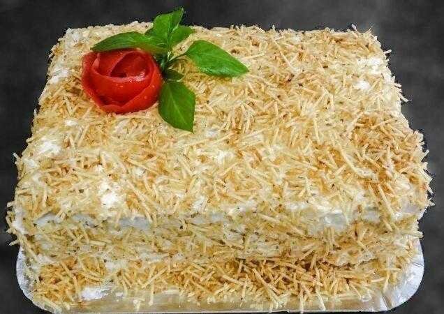 7-Passe a maionese restante em volta do bolo e cubra com a batata palha.