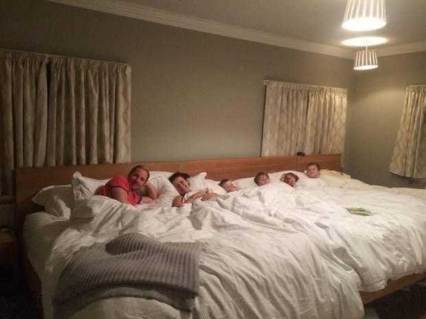 A solução foi utilizar uma cama com 5,5 metros que teria capacidade de acomodar os genitores e proles. Logo a instrutora de ioga Kim Constable, o ex-jogador de rugby conhecido como Ryan, além dos quatro filhos (Corey de 11 anos, Kai de 9, Maya de 6, e Jack, de 5).