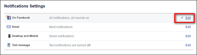 No menu “Notificações”, clique no link “Editar” ao lado de “No Facebook” na parte superior da lista.
