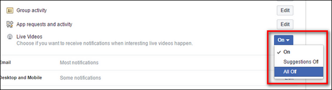 Role para baixo no menu de notificações bastante longas até ver “Vídeos ao vivo” perto da parte inferior. Clique na caixa suspensa ao lado de “Vídeos ao vivo” e altere o padrão “Ativado” para “Desligar”.