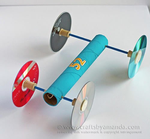 Olha que bacana esse carrinho reciclado com rolinhos de papelão e CD’s. Para fazer é só fazer os furos no rolinho papelão, passar os espetos de madeira e depois colar nos CD’s.