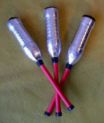 Você só precisa utilizar garrafas PET para ser a parte pesada do instrumento do malabares. Corte o cabo de vassoura no tamanho ideal e cole na garrafa PET. É legal colocar algum peso, como retalhos de tecido ou algo semelhante, dentro da garrafa PET.