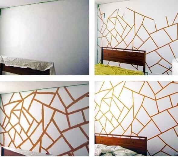 Outra opção bem prática e rápida é com o uso de fita adesiva, que pode ser usada por cima de pinturas já existentes, e vai ajudar na hora de delimitar aonde cada figura será pintada.