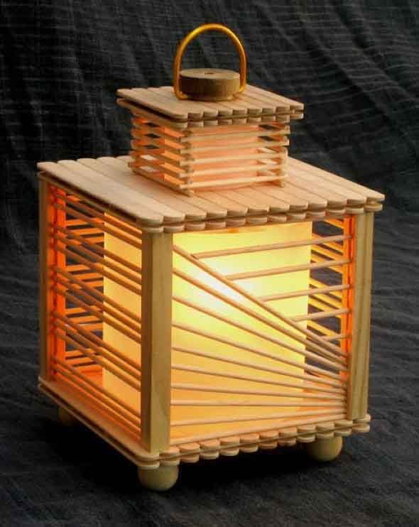 A luminária com palitos de picolé pode ser feita aí na sua casa, com a união dos palitos em vários formatos, como quadrados, triângulos ou outras formas geométricas.