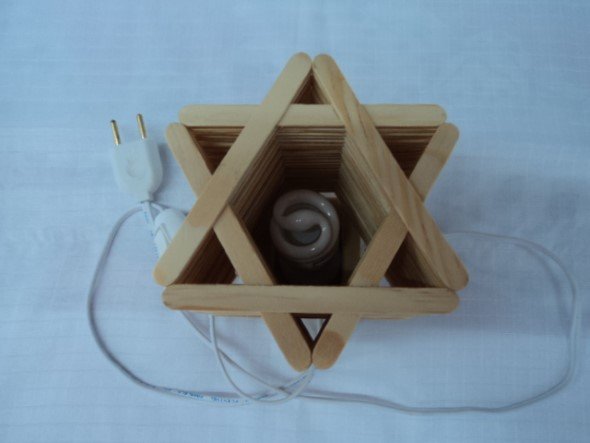 A luminária com palitos de picolé pode ser feita aí na sua casa, com a união dos palitos em vários formatos, como quadrados, triângulos ou outras formas geométricas.