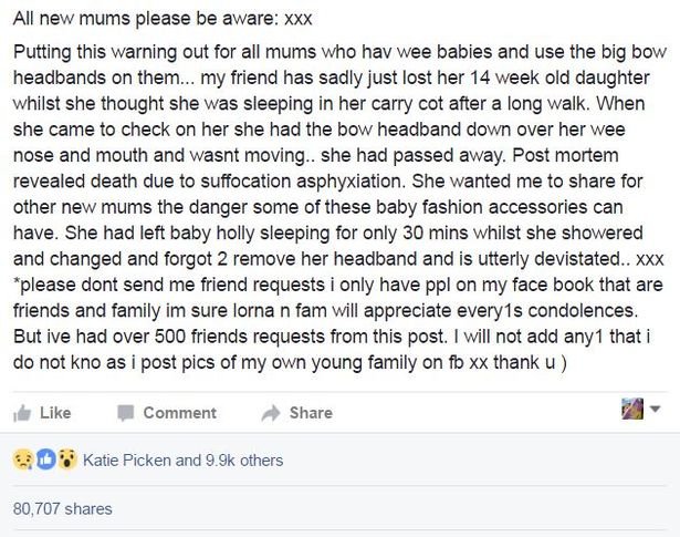 Uma amiga de Leanne perdeu a filha de 14 semanas por um erro ao usar a faixinha na cabeça dela.