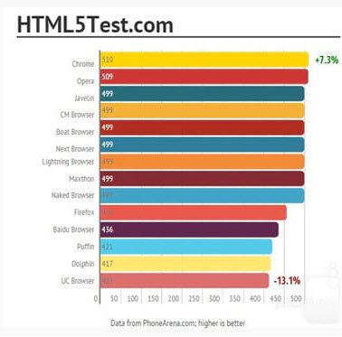 - Chrome se destacou nos testes realizado pelo HTML5, ficou na liderança, com 510 pontos, porém, o UC Browser ficou na lanterninha com 413 pontos.