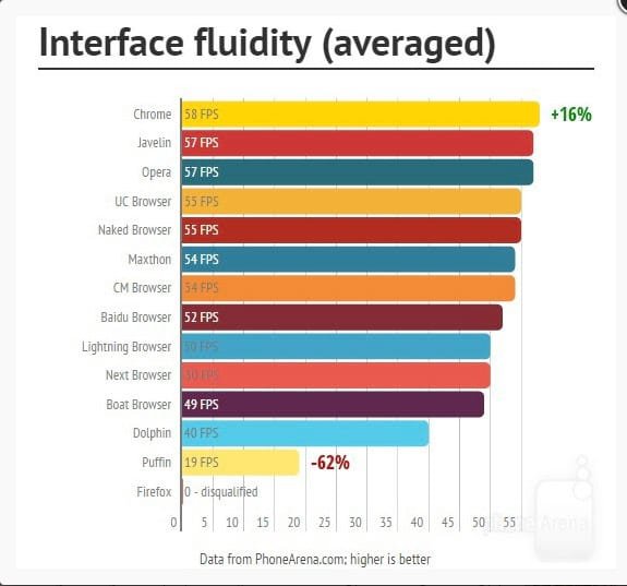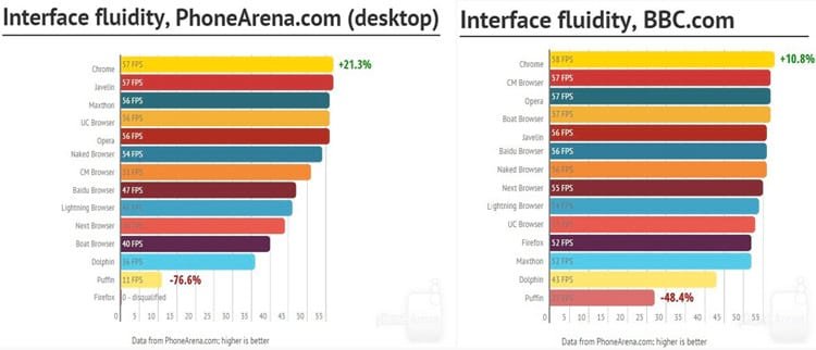 O teste feito com sites da PhoneArena, BBC e Averaged mostrou que o Puffin manteve uma média de 19FPS e assim, ficando na última colocação.
