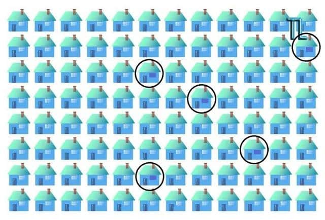 Na ilustração, há 96 residências no total. Embora cada um tenha uma porta, uma janela e uma lareira, eles não são todos iguais.